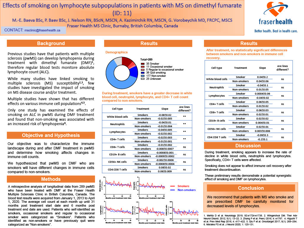 We performed a retrospective longitudinal analysis of our cohort at the Fraser Health Multiple Sclerosis Clinic and stratified 264 patients with MS on DMF into two categories: smokers (including those who smoke occasionally, n=51) and non-smokers (including those who had quit prior to starting DMF, n=213). Linear regression models were created to predict changes in lymphocyte subpopulations over time. Smokers were found to have a significantly greater decrease in white blood cell count (-0.08±0.02), ALC (-0.04±0.005), and CD4+ T cells count (-0.02±0.003) compared to non-smokers (-0.04±0.005, -0.02±0.002 and -0.01±0.001 respectively) during DMF treatment. There were no significant differences in rate of change for CD8+ T cells, CD19+ B cells, NK cells or CD4:CD8 T cell ratio. Additionally, smoking did not appear to impact lymphocyte subpopulation recovery after treatment discontinuation. We conclude that smoking may have a synergistic effect with DMF which exacerbates decreases in certain lymphocyte populations.
